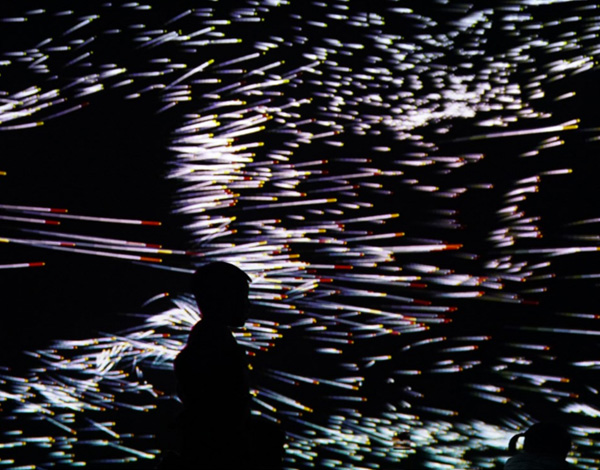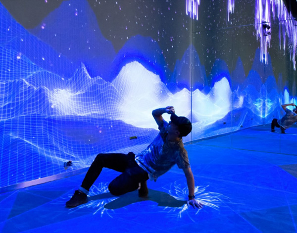 《宇宙共振》,是物理學(xué)概念“共振”的全新詮釋。整屏的粒子象征宇宙的能量,人類和宇宙在某些頻段發(fā)生共振,平行的粒子會根據(jù)體驗(yàn)者的形體發(fā)生偏移而湍流運(yùn)動,呈現(xiàn)不同的形態(tài)。用科技手法把物理概念和細(xì)節(jié)體現(xiàn)的淋漓盡致,在沉浸式體驗(yàn)的同時,也了解了“共振”物理知識。