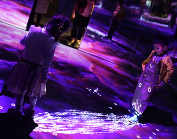 《登陸銀河系》把未知遙遠(yuǎn)的銀河系帶到體驗(yàn)者的腳底,體驗(yàn)者每一個腳步都會產(chǎn)生粒子,這些自帶光圈和紐帶的粒子,如同銀河系中的小星系。當(dāng)?shù)孛婧蜕砩系牧W颖舜伺鲎矔r,粒子化作點(diǎn)點(diǎn)星光,彷佛星系之間發(fā)生的物理化學(xué)反應(yīng)。激發(fā)體驗(yàn)者學(xué)習(xí)探索物理科學(xué)和銀河系的知識。