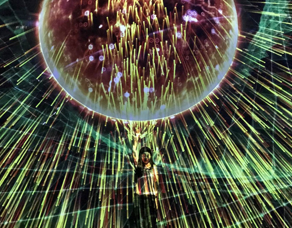 《太陽粒子》展現(xiàn)的是太陽粒子的能量運(yùn)動。太陽是太陽系中心的恒星,是等離子體與磁場交織的一個理想球體,太陽采用核聚變的方式向太空釋放光和熱。體驗(yàn)者可以伸手觸摸,和太陽粒子發(fā)生交互反應(yīng),產(chǎn)生微能量場。該項(xiàng)目意在借助數(shù)字媒體動畫表現(xiàn)手法,向體驗(yàn)者科普太陽和太陽粒子的能量反應(yīng)和能量聚合。